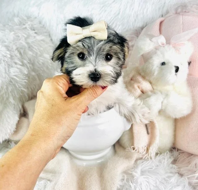 Meet Della, the irresistibly adorable Morkie with a super cute face and the “puppy eyes”. She is rare and has a stunning merle coat. Because we truly believe puppies do better in pairs, we offer a special price on the second puppy when you bring home two. It’s often easier to train both at the same time, and they won’t feel alone or bored when you’re not around. Growing up together helps them adjust faster and brings comfort, fun, and companionship from day one. Plus, you save on delivery when you get two puppies at once. If you’re thinking about getting two, just let us know.