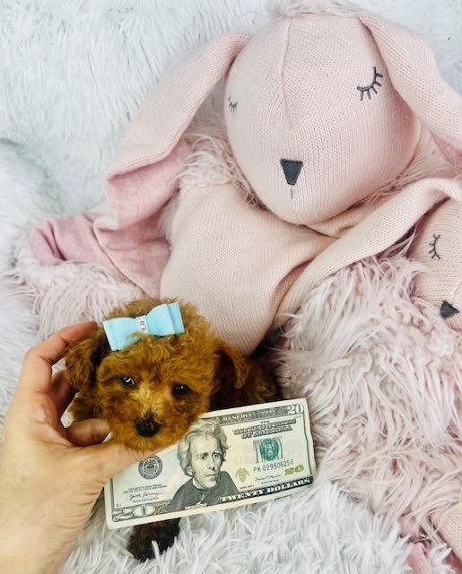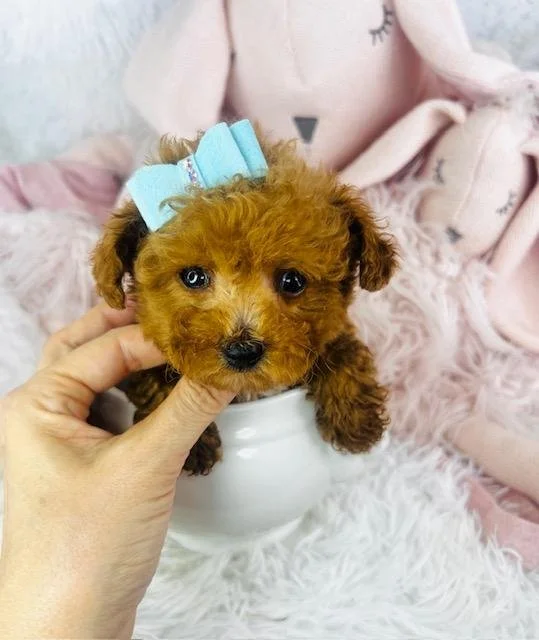 Sweet and stunning Teacup/Pocketbook red Poodle with a very rare dark color. This little Poodle puppy has all his shots and wormings. If you are searching for a Poodle, then consider this little guy because he is adorable. This is one of the smallest Poodles that I have ever seen in 26 years. Please email, and call us after. 954-270-3284 We can hand deliver to your door right away for a small fee. We believe puppies do better when they have a friend so we offer a special price on the second puppy if you bring home two. Training them together is easier and they won’t feel lonely or bored when you’re not around. Growing up with a buddy helps them feel safe and happy. Plus you save on delivery when you get two at once. If you’re thinking about getting two just let us know and we’ll be happy to help.