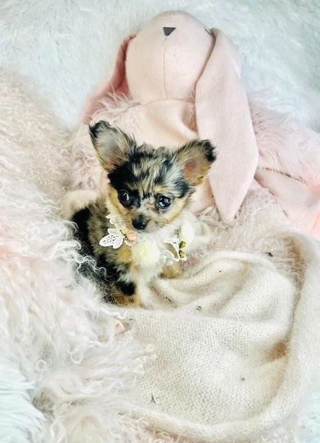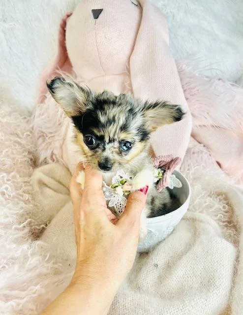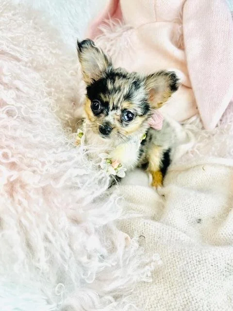 This is a beautiful little Merle Chihuahua, and she’s truly one of a kind. She has a very pretty coat, gorgeous eyes, and he is extremely tiny.