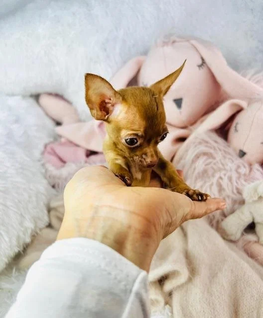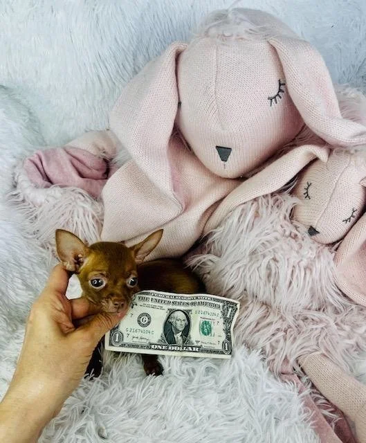 Flower is super cute Teacup Chocolate Chihuahua with a gorgeous face. She is very sweet and small. I love her little chocolate nose and her beautiful eyes. She has all her shots and wormings up to date, and she is eatinng on her own,. If you like her, please email us, and call right after. 954-270-3284. Because we truly believe puppies do better in pairs, we offer a special price on the second puppy when you bring home two. It’s often easier to train both at the same time, and they won’t feel alone or bored when you’re not around. Growing up together helps them adjust faster and brings comfort, fun, and companionship from day one. Plus, you save on delivery when you get two puppies at once. If you’re thinking about getting two, just let us know.
