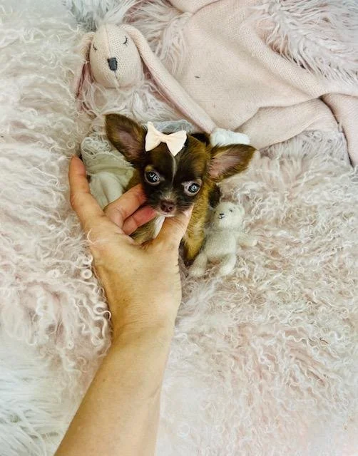 Caren is an adorable Teacup Chihuahua with a super cute face. She loves to eat Royal Canine Petit bites. She is beautiful and sweet. She is extremely small. She is a very special puppy.