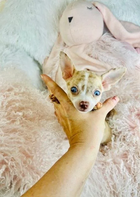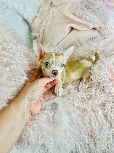 This adorable merle baby with blue eyes is absolutely adorable, with the sweetest face you’ll ever see. She is precious. Gorgeous MERLE WITH BLUE EYES.