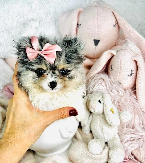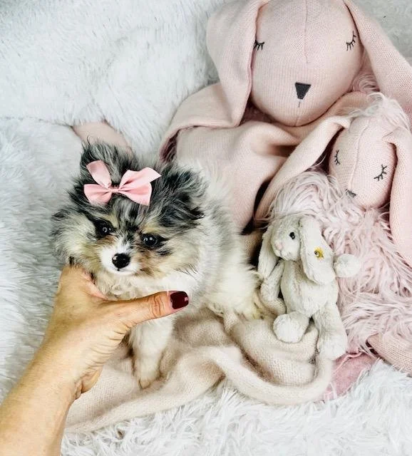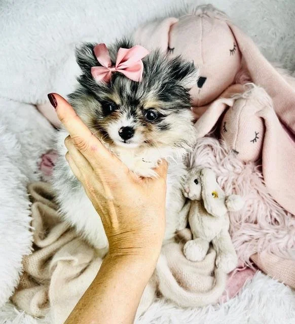 Stunning tiny white and merle Pomeranian with a stunning face. Prisha is a playful and loving puppy that would be perfect for any family looking for a tiny Pomeranian. Pomeranians are friendly, affectionate, and great with children, making them the perfect companion for a loving household. Their small size allows them to easily adapt to apartment living or a cozy home environment. This puppy has a gorgeous all white double coat with stunning markinds. Because we truly believe puppies do better in pairs, we offer a special price on the second puppy when you bring home two. It’s often easier to train both at the same time, and they won’t feel alone or bored when you’re not around. Growing up together helps them adjust faster and brings comfort, fun, and companionship from day one. Plus, you save on delivery when you get two puppies at once. If you’re thinking about getting two, just let us know.