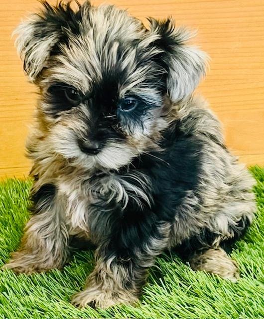 Adorable merle Yorkie puppy with a baby doll face. She is very cute and sweet, and comes with all shots and deworming up to date.